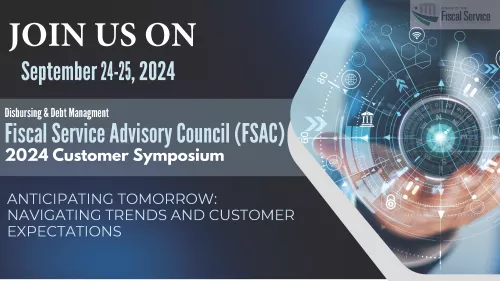 The Bureau of the Fiscal Service, Disbursing & Debt Management (DDM) is hosting the Fiscal Service Advisory Council (FSAC) 2024 Customer Symposium virtually on September 24-25, 2024. Optional breakout sessions will be available in the afternoon of each day.