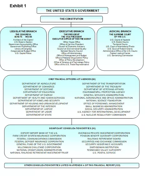 The government’s fundamental mission is derived from the Constitution: “…to form a more perfect union, establish justice, insure domestic tranquility, provide for the common defense, promote the general welfare and secure the blessings of liberty to ourselves and our posterity.” The government’s functions have evolved over time to include health care, income security, veterans benefits and services, housing and transportation, security, and education. Exhibit 1 provides an overview of how the U.S. government is organized.