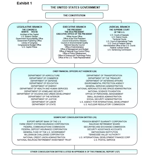 The government’s fundamental mission is derived from the Constitution: “…to form a more perfect union, establish justice, insure domestic tranquility, provide for the common defense, promote the general welfare and secure the blessings of liberty to ourselves and our posterity.” The government’s functions have evolved over time to include health care, income security, veterans benefits and services, housing and transportation, security, and education. Exhibit 1 provides an overview of how the U.S. government is organized.