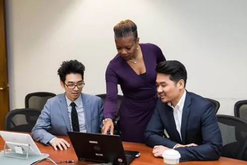 Adrienne Young shows Kenji Aimoto, Financial Management Specialist,