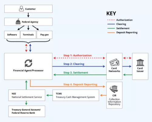 - Transaction authorization, where a payment request initiated with a card account is sent electronically through various parties in the payment card ecosystem (i.e., from the accepting merchant/agency to the acquirer/processor, and routed through the card network to the issuing bank), with an approval or decline message returned back to the acceptance point; and,