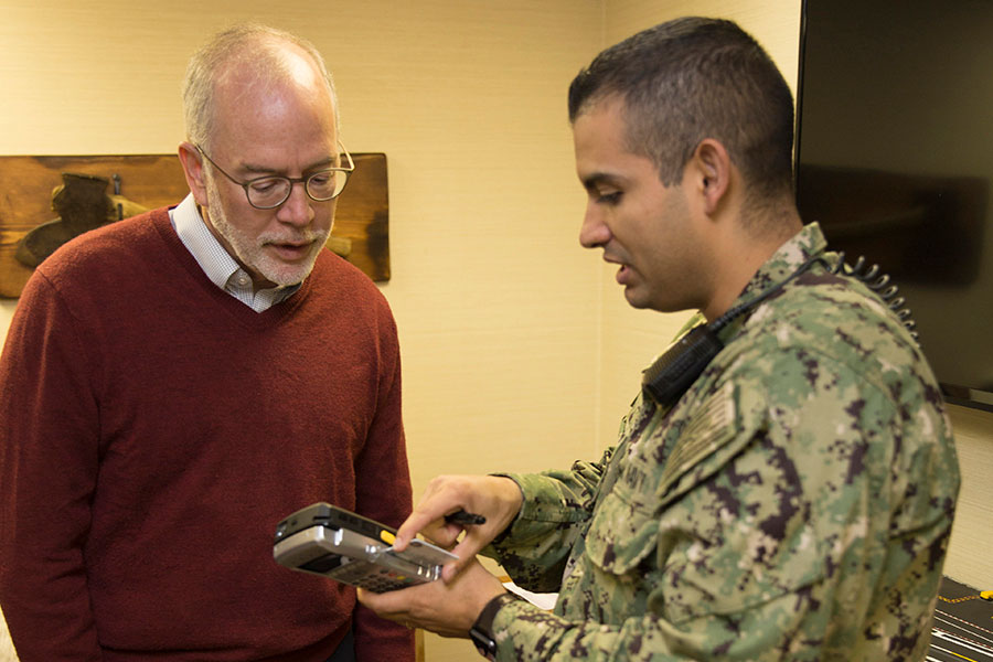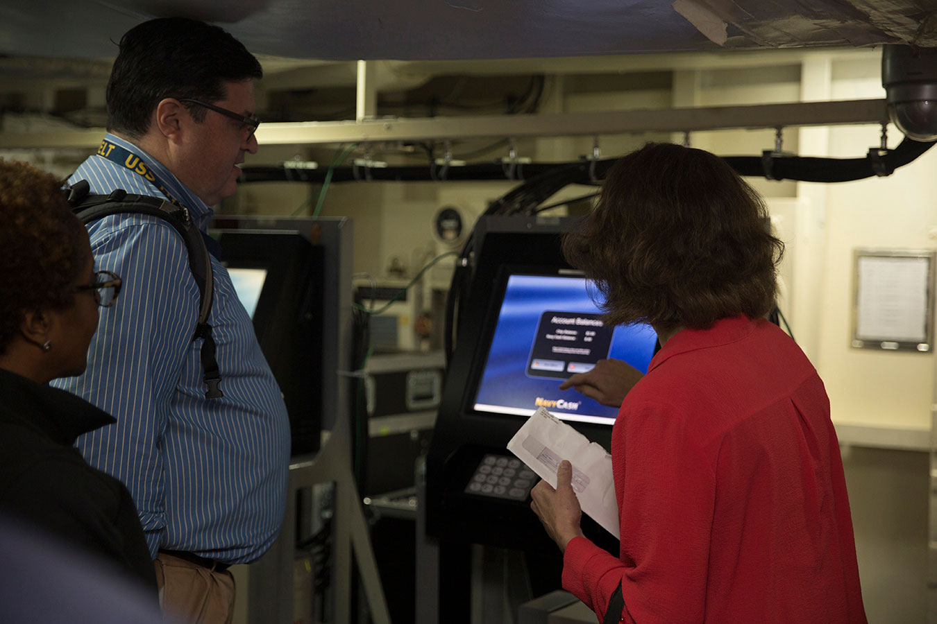 Fiscal Service leadership and Navy Personnel group picture Chief Counsel and sailor looking at device Fiscal Service Commissioner and sailor Payment Management Assistant Commissioner and sailor look at device Chief Information Security Officer and sailor inspect device Navy staff look at device Navy Cash Assistant Program Manager and sailor Fiscal Service Director and sailor look at Point of Sale Device Navy Cash kiosk Fiscal Service staff and Navy personnel inside ship Ship’s Disbursing Office Fiscal Service leaders in ship’s store Fiscal Service leaders in ship’s store Fiscal Service leadership and Navy personnel inside ship Chief Privacy Officer and Commissioner on Flight Deck